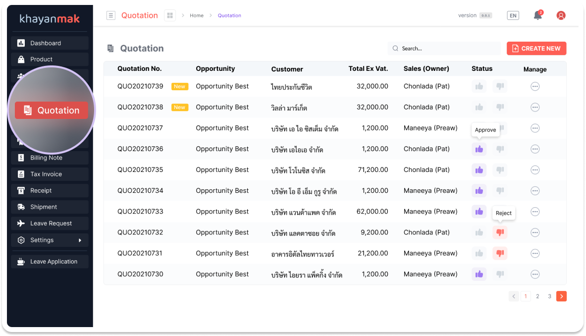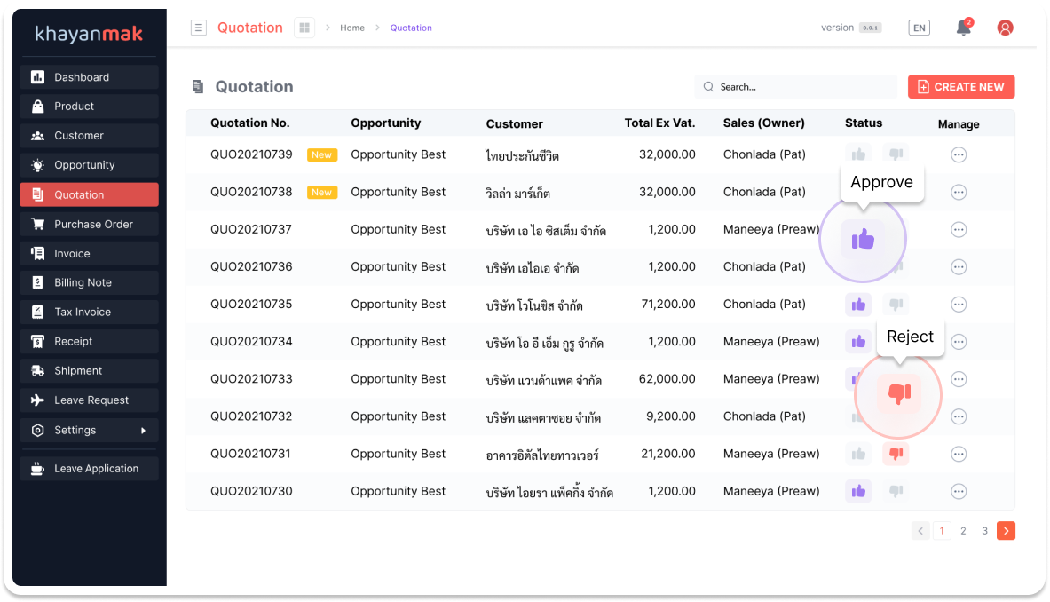 -> จากนั้นหัวหน้าจะกดอนุมัติใบเสนอราคาจากระบบ Khayanmak ซึ่งคุณสามารถเข้ามาดูสถานะของใบเสนอราคาได้ตรงเมนู Quotation จะขึ้น Status ว่าได้รับการอนุมัติ, รออนุมัติ หรือปฏิเสธ หากได้รับการอนุมัติแล้ว คุณสามารถกดดาวน์โหลดเป็นไฟล์ PDF เพื่อส่งให้ลูกค้าได้เลยค่ะ