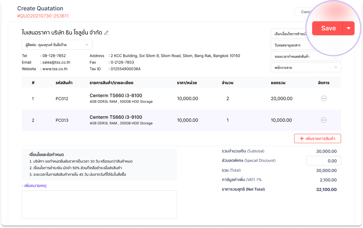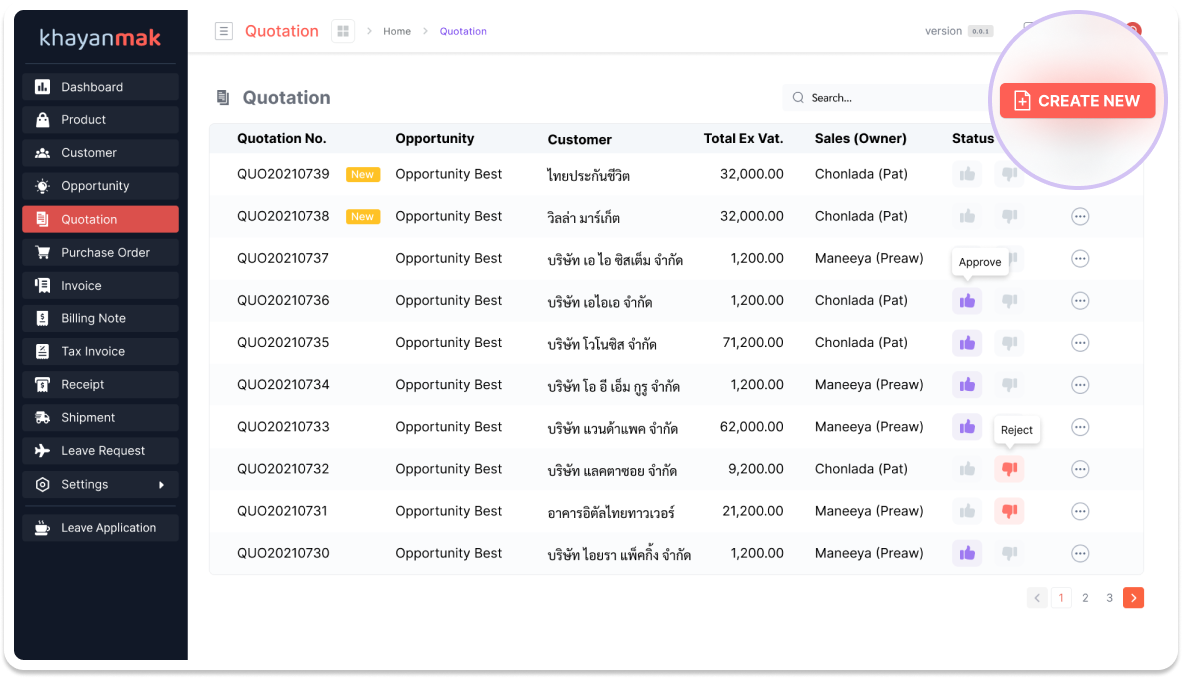 ออกใบเสนอราคาผ่านออนไลน์อย่างรวดเร็วส่งให้เจ้านายกดอนุมัติผ่านระบบออนไลน์ได้เลย และหากเป็นลูกค้าเก่าที่มี Contact บันทึกไว้ในระบบ Khayanmak อยู่แล้ว สามารถกรอกชื่อบริษัทแล้วดึงข้อมูลใส่ลงใบเสนอราคาได้เลยโดยไม่ต้องพิมพ์ใหม่ทุกครั้ง