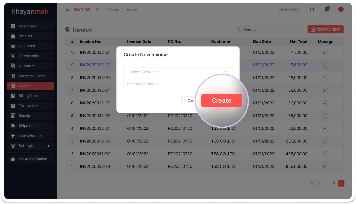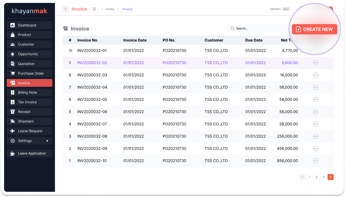 Step 1 – เข้าไปที่เมนูใบแจ้งหนี้ (Invoice) และ คลิกที่ +Create New