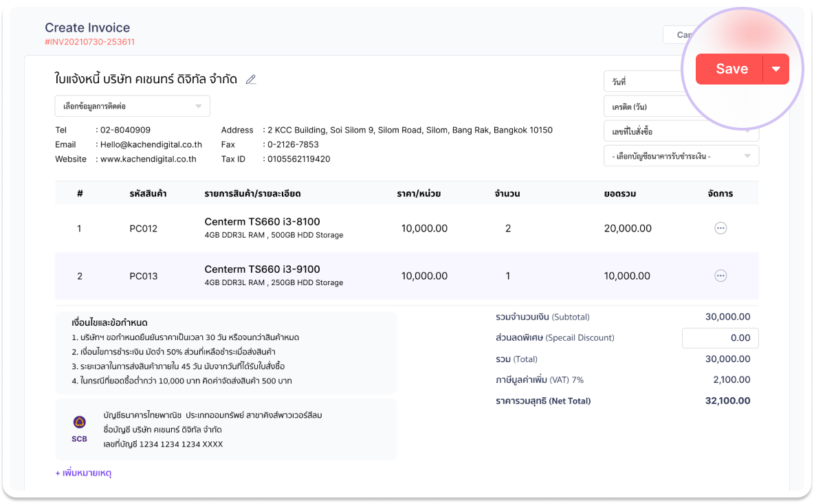 สามารถเลือกวันที่ออกใบแจ้งหนี้ เลือกเครดิตวันที่ต้องชำระเงิน และเลือกบัญชีธนาคารที่รับชำระเงินจากนั้นตรวจสอบรายละเอียดข้อมูล ของการชำระสินค้า จากนั้นคลิก Save