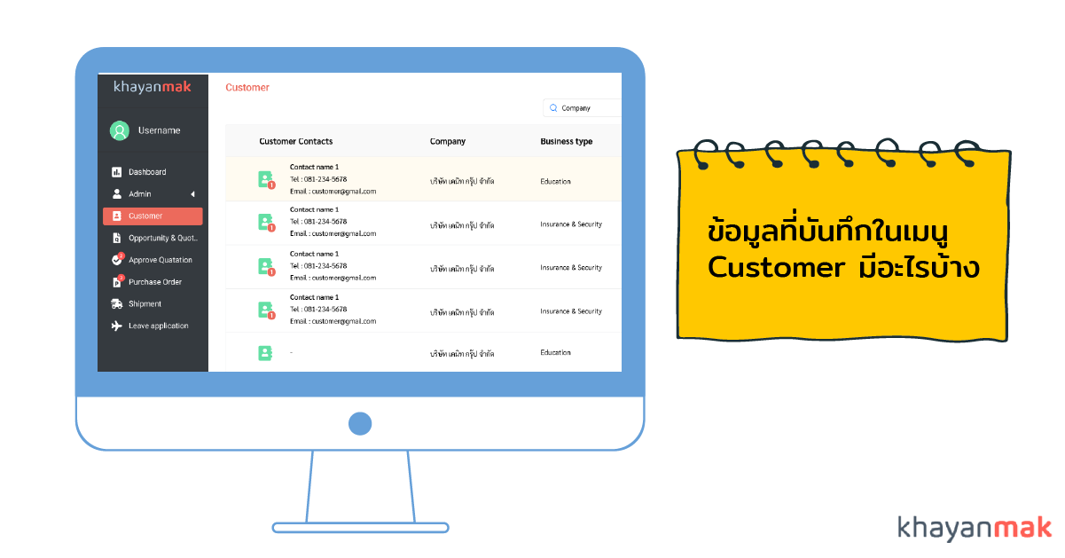 ในระบบ CRM ขนาดย่อมจาก Khayanmak จะสามารถบันทึก contact ของบริษัทลูกค้า และผู้ติดต่อได้อย่างละเอียดลงในระบบออนไลน์ ข้อมูลลูกค้าไม่มีทางสูญหาย และสามารถเปิดเว็บบราวเซอร์เพื่อบันทึกได้ทุกที่ ทั้งใน PC และสมาร์ทโฟน ไม่ต้องกลัวลืมข้อมูลบริษัทของลูกค้า