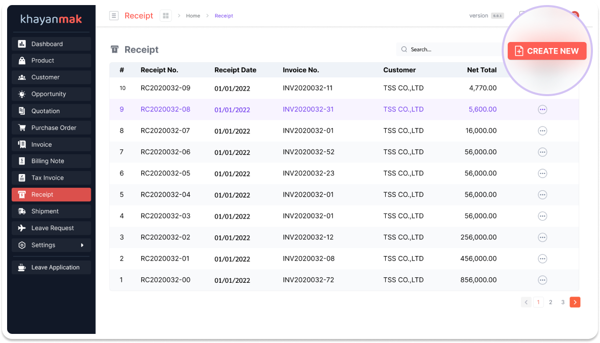Step 1 – เข้าไปที่เมนูใบเสร็จรับเงิน (Receipt) คลิกที่ +Create New